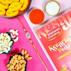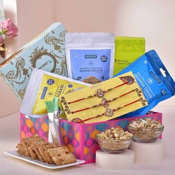 This is a gift of: � Rakhi (Design Code: LUMK9325, KPRK0289) � Plain Cashews (200g) � Almonds (200g) � Raisins (200g) � Complimentary Roli, Tika & Chawal Thali � Decorated in a beautiful Tray � All these comes packed beautifully in a Reusable Signature Outer Box