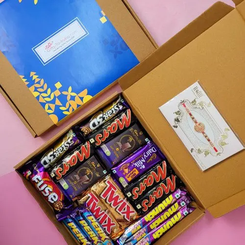 Add sweetness and sparkle to your Rakhi celebration with this decadent gift box. Featuring a stunning Kundan Rakhi (PRRK1420B), the hamper is overflowing with rich, chocolatey delights�Cadbury Fuse, Dairy Milk Roast Almond, 4 Mars bars, Bournville, 5 Star 3D, Twix, Munch, and Perk�making it a treat-filled surprise your brother will adore. With the traditional Roli Chawal Tika included, and all items thoughtfully arranged in an elegant box, this gift set offers the perfect combination of festive spirit and gourmet indulgence.