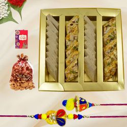 This gift hamper includes: � One Designer Pearl and Beads Rakhi � Chhappan Bhog Besan Laddoo CD Box (200 gm) � Chhappan Bhog Roasted N Salted Cashew Nut Can (100 gm) � A Celebrating Happiness Hamper