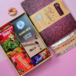 Make Raksha Bandhan memorable with a thoughtful blend of tradition and taste. This gift set features an exquisite Kundan Rakhi by Rakhi Sutra (PRRK1420A) that embodies timeless elegance and festive spirit. Paired with the luxurious Cadbury Bournville Cranberry Dark Chocolate Bar (80g), it adds a touch of sweetness and sophistication to the celebration. The set also includes complimentary Roli Tika and Chawal to honor traditional rituals, along with a message card that allows you to convey heartfelt emotions. Celebrate the joy of this special occasion by gifting your brother a symbol of love wrapped in tradition and delicious indulgence.