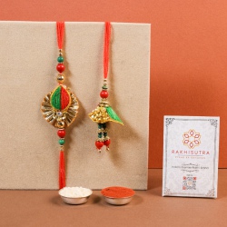 Make this Raksha Bandhan unforgettable with a beautifully curated gift set that brings together tradition, taste, and heartfelt emotion. Featuring a Set of 2 Ganesha N Kundan Rakhi by Rakhi Sutra (SET2-05), these intricately designed rakhis are a symbol of divine protection and timeless elegance. To add sweetness to the occasion, the set includes a delicious Twix (50g) and Mars (51g) chocolate bar, making your celebration extra special. It also comes with complimentary Roli Tika and Chawal for the traditional ceremony and a free message card to convey your love and blessings. This gift set is a perfect expression of your affection on Raksha Bandhan.