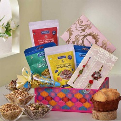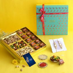 Make this Raksha Bandhan truly memorable with a gift that combines tradition, elegance, and indulgence. This gift pack includes four intricately designed rakhis by Rakhi Sutra: a regal Peacock Rakhi (KPRK0289), a powerful Shiva Rakhi (QUR8219Y), a chic Designer Rakhi (QURBR0406), and a luxurious Zardosi Lumba Rakhi (SAJLUM1200C) to celebrate your bond with both brothers and bhabhis. To add a sweet touch, the hamper features a rich assortment of chocolates, including Hershey�s Zest (100g), a smooth Galaxy Milk Chocolate (56g), and two delightful boxes of Nutties (30g each). Traditional roli tika and chawal are included to complete the rituals, along with a heartfelt message card�all packed with love and delivered with free Rakhi.