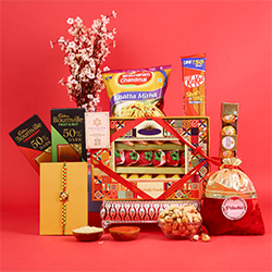 This Raksha Bandhan, express your love with a graceful and meaningful gift set that captures the essence of the occasion. The set includes a beautiful Kundan Rakhi (KPRK8120) and a matching Kundan Lumba Rakhi (PDL9232) by Rakhi Sutra, ideal for celebrating the cherished bond with your bhaiya and bhabhi. To sweeten the day, it comes with two boxes of Galaxy Milk Chocolate (56g each), offering smooth, delightful indulgence. Accompanied by complimentary Roli Tika, Chawal, and a message card, this set brings together everything needed for a heartfelt and memorable Rakhi celebration.