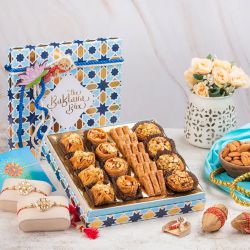 This Raksha Bandhan, make your celebrations extra special with our Divine Ganesha Rakhi N Gifts Set. Featuring a beautiful Ganesha Rakhi by Rakhi Sutra (PDGRKA455), this set symbolizes protection and blessings from Lord Ganesha. The gift set also includes a Vignesh Ganesh idol that can be placed in your home for added spiritual significance. To sweeten the occasion, weve added Kesar Laddu � a traditional Indian sweet delicately flavored with saffron. The set also comes with a Golden Plated Thali, perfect for conducting the Rakhi rituals. This all-in-one hamper encapsulates the essence of Raksha Bandhan, combining traditional elements with delightful treats, making it an ideal gift for your beloved brother.