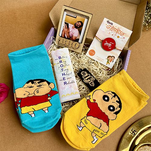 This is a gift hamper of: � A Bhai Rakhi � 2 Pair of Shinchan Socks � A Dairy Milk Chocolate with Rakhi Theme Packaging � A Personalized BRO Photo Frame Magnet � A #1 BRO Wooden Keychain