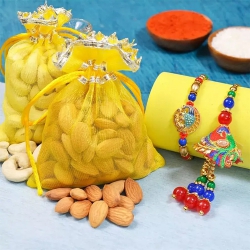 Delight your Bhaiya and Bhabhi with our Classic Evil Eye Bhaiya Bhabhi Rakhi N Sweet Combo. This elegant Rakhi set features an intricate Evil Eye design, symbolizing protection and positive energy. To make the occasion sweeter, it includes 500 grams of mouth-watering Gulab Jamun. Celebrate the essence of Raksha Bandhan with the included Roli, Tika, and Chawal, ensuring all traditional rituals are followed. The complimentary message card allows you to express your love and warm wishes. Thoughtfully prepared, this gift set is sure to bring a smile to their faces and make the festival memorable.