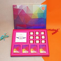 Delight your Bhaiya and Bhabhi with our Classic Evil Eye Bhaiya Bhabhi Rakhi N Sweet Combo. This elegant Rakhi set features an intricate Evil Eye design, symbolizing protection and positive energy. To make the occasion sweeter, it includes 500 grams of mouth-watering Gulab Jamun. Celebrate the essence of Raksha Bandhan with the included Roli, Tika, and Chawal, ensuring all traditional rituals are followed. The complimentary message card allows you to express your love and warm wishes. Thoughtfully prepared, this gift set is sure to bring a smile to their faces and make the festival memorable.