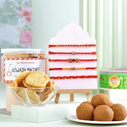 Embrace the essence of Raksha Bandhan with our Divine OM Rakhi N Sweets Combo. This gift features an intricately designed OM Rakhi by Rakhi Sutra, representing divine protection and grace. Accompanying it is a 1kg pack of mouth-watering Gulab Jamun, ensuring a sweet treat for your beloved brother. We also provide complimentary Roli Tika N Chawal for the customary rituals, along with a heartfelt message card. The Rakhi comes free of charge, making this combo an irresistible blend of tradition and sweetness.