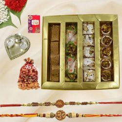 This is a gift of: � An AD Rakhi by Rakhi Sutra (QUR7866Y) � Soan Papdi (200g) � Complimentary Roli Tika N Chawal � Complimentary Message Card with Free Rakhi