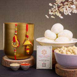 Add a touch of elegance to your Raksha Bandhan celebrations with our Festive Kundan Rakhi and Sweet Combo. This beautiful gift set includes a floral Kundan Rakhi by Rakhi Sutra, crafted with intricate detail and vibrant colors. Alongside it, enjoy a 200g box of Soan Papdi, a traditional Indian sweet that enhances the festive spirit. We also provide complimentary Roli Tika and Chawal to complete the traditional rituals. A complimentary message card allows you to share your heartfelt wishes. This thoughtfully curated combo brings together tradition, sweetness, and love, making it an ideal gift to celebrate the special bond with your sibling.