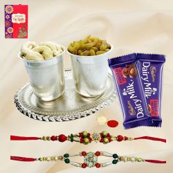 This is a gift of: � Set of 2 Kundan Rakhi by Rakhi Sutra (PRRK8292D, PRRK1440) � Dodha Barfi (200g) � Red Chilli Cashew (100g) � Designer Rakhi Thali � Complimentary Roli Tika N Chawal � Complimentary Message Card with Free Rakhi