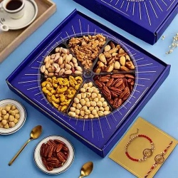 Embrace the joyous spirit of Raksha Bandhan with our Premium Kundan Rakhi with Black Pepper Cashews Combo. This combo features a beautiful Kundan Rakhi crafted by Rakhi Sutra, perfect to signify your love and protection for your sibling. Alongside, youll find a 250g jar of Black Pepper Cashews, adding a dash of spice and flavor to the festivity. The gift also includes complimentary Roli, Tilak, and Chawal, which are essential elements for an auspicious celebration. A free Rakhi and a heartfelt message card are added to let you convey your warmest wishes. This combination of tradition and taste is sure to make the festival more special.