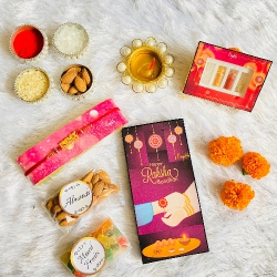 Celebrate your sibling bond with our Kundan Rakhis with Butterscotch Laddu Joy set. This premium gift features two stunning Kundan Rakhis from Rakhi Sutra (SET2-01), beautifully designed to add elegance to your Raksha Bandhan celebration. Accompanying these rakhis is a 250g pack of delectable Kaju Butterscotch Laddus, promising a burst of sweet flavors in every bite. To enhance your festive traditions, we�ve included complimentary Roli Tika, Tilak, and Chawal. Additionally, a free rakhi and a personalized message card are added to make your gesture even more special. Show your brother how much he means to you with this charming rakhi set.