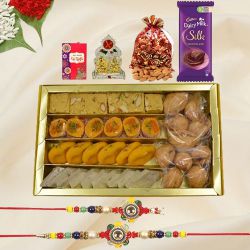 This box includes : � 1 Kundan Rakhi With Card � 1 Strawberry Crisp Chocolate Log (23 Gms) � 2 Almond Florentines (26 Gms Each) � 6 Assorted Chocolates{( Roasted Almond (13 Gms) , Cranberry (13 Gms) , Oreo (13 Gms), Butterscotch (13 Gms), Orange Crisp(12 Gms), Fruit And Nut -(12 Gms)} � 1 Bottle Masala Nut (110 Gms ) � Piri Trail Mix ( 80 Gms) � 1 Bottle Sweet And Spicy Trail Mix (100 Gms) � Salted Cashew (110 Gms) � 1 Kum Kum Thali