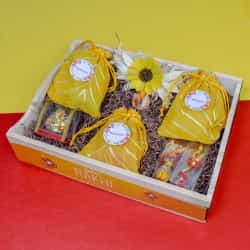 Celebrate Raksha Bandhan with our meticulously curated Raksha Bandhan Bliss Box. Inside, you�ll find a delightful mix of treats and traditional items sure to make this sibling festival special. Start with the sweet and spicy trail mix, a perfect blend for those who love a snack with a kick. Dive into our raisins fusion coco delight bar, offering a rich, chocolatey experience. Enjoy the crunch of two almond florentines. Embrace tradition with a kum kum thali, adding a sacred touch to the celebration. To top it all off, weve included an evil eye rakhi paired with a heartfelt card. Satisfy your sweet tooth with 12 assorted chocolates, featuring flavors like roasted almond, cranberry, Oreo, butterscotch, orange crisp, and fruit and nut, neatly packed in a potali. Finally, a small coconut completes the set, adding a symbolic, traditional gift. This bliss box is a thoughtful gift designed to foster cherished memories and joy.