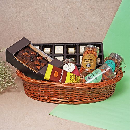 Indulge in a Basket of Tradition, a curated collection of delights that brings heartwarming flavors to your celebrations. Start with the delectable Date and Walnut Tea Cake (400 gms), a perfect treat to enjoy any time of the day. Savor the richness of 12 assorted chocolates, including irresistible varieties like Roasted Almond, Cranberry, Oreo, Butterscotch, Orange Crisp, and Fruit and Nut. Enhance your snacking experience with a Roasted Almond Chocolate Bar (40 gms). Our hamper also features a bottle of zesty Piri Piri Trail Mix (80 gms), a Sweet and Spicy Trail Mix (100 gms), and savory Masala Nuts (110 gms). Complementing these gourmet treats is a charming rose mottled scented jar to create a fragrant ambiance, and a thoughtful Rakhi card to convey your heartfelt wishes. This hamper is an ideal gift for any festive occasion.