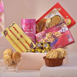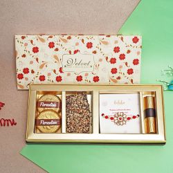 This hamper includes : � 1 Bottle Piri Piri Trail Mix (80 Gms) � 1 Bottle Salted Almond (110 Gms) � 6 Almond Rocks (12 Gms Each) � 1 Masala Cranberry Coco Delight Bar (20 Gms) � 1 Almond Seasalt Coco Delight Bar (20 Gms) � 1 Jasmine Scented Candle � 1 Rakhi Card