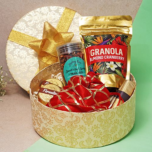 Indulge in a delightful celebration with our Rakhi Hamper With Sweet Treats. This carefully curated hamper is a treasure trove of treats perfect for any festive occasion. Savor the crunchy goodness of 2 almond florentines, paired with a zesty sweet and spicy trail mix. Dive into a potali of 12 assorted chocolates featuring flavors like roasted almond, cranberry, oreo, butterscotch, orange crisp, and fruit and nut. Enjoy the wholesome crunch of our almond cranberry granola pouch that promises a healthy bite. The hamper also includes 2 delightful strawberry crisp logs for a burst of fruity sweetness. To make it even more special, a beautiful rakhi card is included, making this hamper a perfect blend of taste and tradition.
