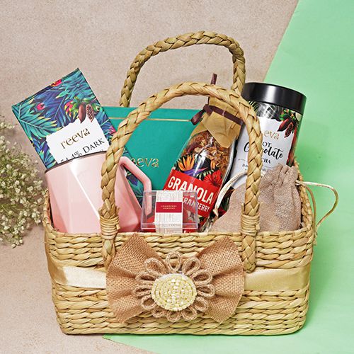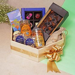 Experience a moment of endless bliss with our Endless Joy Hamper. Nestled inside, youll discover a delightful assortment of 6 bon bons, each one a unique flavor journey: palet dor, passion fruit caramel, salted caramel ganache, hazelnut feuilletine crunch, orange caramel, and espresso. Relish enjoying these gourmet treats with the charming mug included. For a wholesome crunch, indulge in our almond cranberry granola (150gms) and delight in the 6 pure chocolate almond rocks (12gms each). Move onto our exquisite cranberry dragees (60gms) and savor the rich taste of the 54.4% dark Belgian chocolate with hazelnut (60gms). Finally, warm your soul with our hot chocolate mocha (180gms) as you admire the thoughtful touch of the included rakhi card. This hamper is a symphony of flavors and textures, perfect for pampering yourself or a loved one.