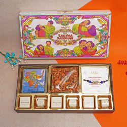 The gift hamper consists of: � Handmade Chocolate Box (16 Pcs) � Rakhi Set of Two � Roli Chawal Card