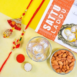 Indulge in the spirit of Raksha Bandhan with our Charming Rakhi Celebration Set with Baklava N Plant. This thoughtful gift includes a beautifully crafted Zardosi Bhaiya Bhabhi Rakhi by Rakhi Sutra, perfect for celebrating the special bond between siblings. Savor the rich flavors of Pyramid Baklava (90g) that adds a sweet note to your festivities. Complete the experience with a stunning Jade plant in a ceramic pot, bringing life and positivity to your home. We also provide complimentary Roli, Tilak, and Chawal alongside a message card, ensuring your wishes resonate deeply. Celebrate the joy of togetherness and create cherished memories with this exquisite gift set.