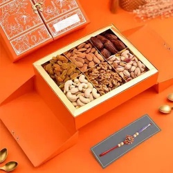 This gift box includes: � A Rakhi � 10 pieces Assorted Flavour Chocolates (Roasted DryFruit Filling, Cranberry Filling, Paan Filling, Butterscotch Filling, Mix Fruits Filling, Chocochip Filling) � Almonds (100g) � Mixed Fruits (100g) � Set of Tikka, Chandan, Chawal, Mishri � A Rakhi Theme Greeting Card