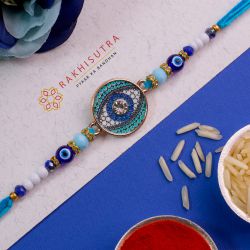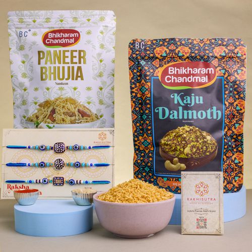 This gift includes: � Set of 3 Evil Eye Rakhi by Rakhi Sutra (EVD0475, EVD7510Y, EVD7515) � Paneer Bhujia (150g) � Kaju Dalmoth (200g) � Complimentary Roli Tika N Chawal � Complimentary Message Card with Free Rakhi