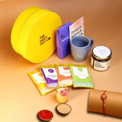 This gift includes: � An Evil Eye Rakhi by Rakhi Sutra (EVDA0299) � Ajwan Khari (200g) � Karma Kettle Fruitea Collection Tea (18 Tea Bag) � Fun Quote Mug � Complimentary Roli Tika N Chawal � Complimentary Message Card with Free Rakhi