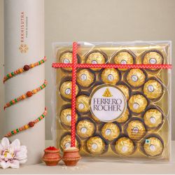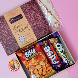 Get ready to celebrate the beautiful bond of Raksha Bandhan with our Designer Rakhi Gift Box! This elegant set includes three intricately designed Kundan Rakhis by Rakhi Sutra, perfect for honoring your brother. Alongside these beautiful rakhis, enjoy a box of six scrumptious Chandrakala sweets, which are sure to delight everyones taste buds. We havent forgotten the essentials! Our gift set comes with complimentary Roli Tika N Chawal, allowing you to perform traditional rituals seamlessly. Plus, there�s a message card to express your sentiments. Whether for a brother or sister, this gift box embodies the spirit of love and festivity, making it the perfect Raksha Bandhan surprise!
