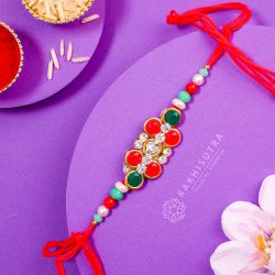 Bring joy to your siblings heart with our delightful Designer Rakhi Gift Hamper. Thoughtfully curated, this set features a stunning Rakhi by Rakhi Sutra, embodying the timeless connection between siblings. The highlight is a lavish box of 6 Chandrakala sweets that promise to excite their taste buds. But thats not all! Weve included complimentary Roli Tika N Chawal for those traditional touches, along with a special message card to express your warm wishes. This beautiful gift set elegantly blends tradition with sweetness, making it an ideal choice for Raksha Bandhan. Gift this lovely hamper and create cherished memories filled with love, laughter, and delicious treats that will be remembered for years to come!
