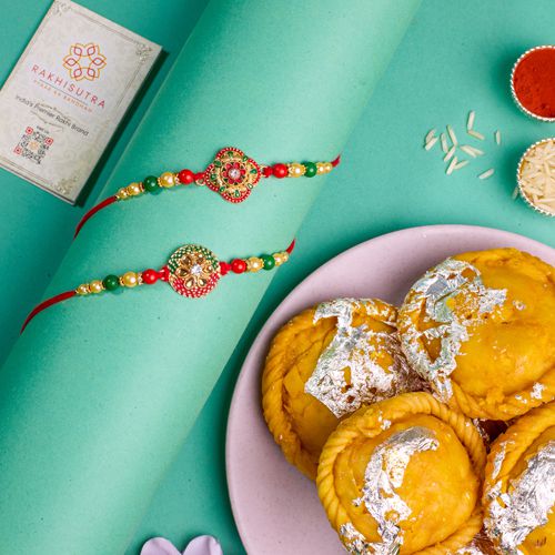 Express your love and best wishes with our Rakhi Gift Set Delight. This set is designed to make Raksha Bandhan special with two beautifully crafted Designer Rakhis by Rakhi Sutra. Along with the Rakhis, you�ll find a box of 6 delightful Chandrakala sweets that perfectly complement the festive atmosphere. To make your gift even more profound, weve added complimentary Roli Tika N Chawal and a heartfelt message card. The stunning Rakhis infuse an aura of love and protection, while the sweets bring an element of celebration. This gift set is an ideal way to celebrate the bond you share with your sibling, making the day unforgettable.