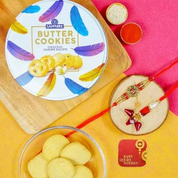 Embrace the spirit of Raksha Bandhan with our exclusive Elegant Rakhi Treat Hamper. This hamper features two intricately designed Rakhis by Rakhi Sutra, each one embodying love and protection. To sweeten your celebration, enjoy 500g of luscious Rasgulla, complemented by 100g each of crunchy almonds and smooth cashews. This set also includes Roli Tika N Chawal, representing traditional customs, and a message card to convey your warm wishes. It�s a delightful collection that�s perfect for sharing joyous moments and making cherished memories with your loved ones.