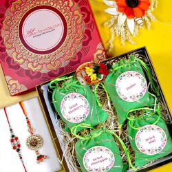This gift box includes: � Set of 2 Designer Rakhis � Rivona Naturals Honey and Saffron Lotion (250 ml) � Rivona Naturals Honey and Saffron Face Wash (100 ml) � Rivona Naturals Sunscreen SPF50 (100 ml) � Rivona Naturals Honey and Saffron Face Cream (50g) � Rivona Naturals Vitamin C Serum (30 ml)