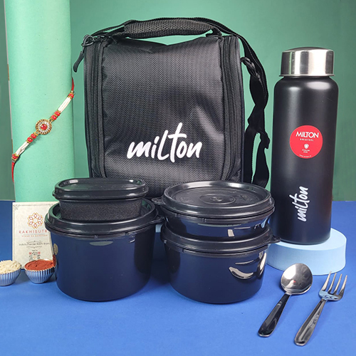 This gift combo includes: � An AD Rakhi by Rakhi Sutra (PRRK1410) � Milton Lunch Box Set � Complimentary Roli Tika N Chawal � Complimentary Message Card with Free Rakhi
