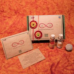 This gift consists of: � Two Plantable Nazarbattu Rakhi (Nazarbattu rakhi and lumba) � One Rakhi Instruction Card Tag � One Greeting Card � One Rakhi Envelop � Roli-Chawal � Marigold Seed Ball