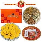 This gift consists of: � 1 Rakhi � 1 Raksha Bandhan Chocolate Bar ( 35g) � Mix Fruit (50g) � Almonds (50g � 1 Jute Potli � 1 Raksha Bandhan Box � 1 Tika Set � 1 Greeting Card
