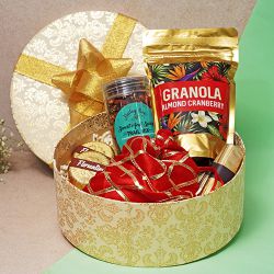 This is a gift of : � Set of 2 Bhaiya Rakhi-SAJ2904,PDGRK0125 � Haldiram Mini Samosa - 200 gm � Haldiram Bhujia - 200 gm � Haldiram Kesar Laddu 250gm � Haldiram Kaju Barfi - 100 gm � Haldiram Gulab Jamun 500gm � Free Small Message Card with Mouli Rakhi � Roli, Chawal for Tika � A Reusable Gift Box