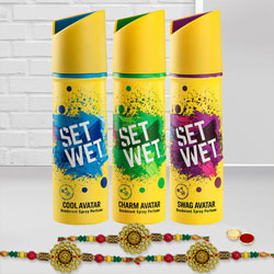 Celebrate the bond of brotherhood with this Stylish Rakhi N Perfumes Elegance. Each 20ml fragrance�Velvet, Twilight, Voyage, and Insense�comes beautifully packaged with a Rakhi, making it a delightful surprise for your beloved brother on Raksha Bandhan.
