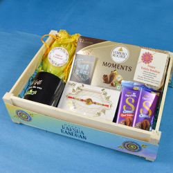 This gift consists of: � Designer Bracelet Look Rakhi. � 5pcs Chappan Bhog Roseberry Bite. � Roli Chawal Card.