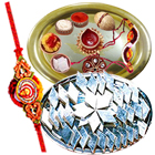 Assorted Sweets containing Badam katli, Kaju Pista Roll, Dry Fruits Chakki and Kaju Barfi from Haldiram 250 Gr. (Gross Weight) and Stylish and Trendy looking Silver Plated Paan Shaped Puja Aarti Thali (weight 52 gms) along with Rakhi, Roli Tilak and Chawal