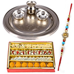 Assorted Sweets containing Badam katli, Kaju Pista Roll, Dry Fruits Chakki and Kaju Barfi from Haldiram 1 Kg (Gross Weight) and Stylish and Trendy looking Silver Plated Paan Shaped Puja Aarti Thali (weight 52 gms) along with Rakhi, Roli Tilak and Chawal