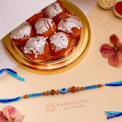 Send your blessings with this exquisite Rakhi hamper featuring Evil Eye Rakhis, dry fruits, Raffaello, mojito, and candy�all beautifully arranged in a premium white cane basket.