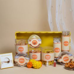 This Kundan Swastik Rakhi Celebration Pack beautifully merges tradition with elegance. The detailed Kundan work expresses love and protection. Included are roli tika and chawal to complete your rituals, as well as a heartfelt message card to convey your best wishes. A splendid way to cherish the sibling bond on Raksha Bandhan.