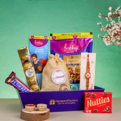 This gift consists of: � Premium OM Rakhi (OMPRK1511) � Premium Ganesh Rakhi (GANPRRK8052) � 2 pcs Cadbury Bournville Cranberry Dark Chocolate Bar (80g) � Dairy Milk Roast Almond Chocolate Bar (36g) � Cadbury Dairy Milk Crackle Chocolate Bar (36g) � The Daily Nut Co. - Cashews (50g) � The Daily Nut Co. - Almond (50g) � Ferrero Rocher 16 Pieces Box (200g) � Twinings - English Breakfast Tea (50g) � Reuseable Gift Box