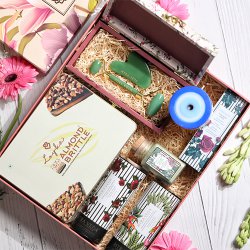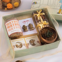 Celebrate your bond this Raksha Bandhan with a quirky bro rakhi paired with the Festive Treats n Bro Rakhi Hamper. Indulge in classic channa barfi, crunchy jhaal chanachur, chocochip cookies, and mewa delights of pistachio and raisin. Two Dairy Milk Roast Almond bars add a creamy touch, all elegantly packed in a reusable gift box. Thoughtful, playful, and full of flavour, this hamper makes the festival truly memorable.
