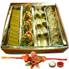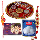 Special Gold Plated Thali with 2 Free Rakhi, Haldiram Kaju Katli 500 Gr. (Gross Weight) and 500 Gr. (Gross Weight) Dry Fruits, Roli Tilak and Chawal (Size: 5-6 inch)