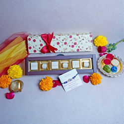 Celebrate the sacred bond of Raksha Bandhan with the Rudraksha Rakhi & Bournville Combo, a delightful fusion of spiritual charm and premium indulgence. This gift set includes a beautifully crafted Rudraksha Rakhi symbolizing protection and blessings, paired with two decadent Cadbury Bournville chocolate bars�Raisins & Nut (80 gms) and Cranberry (80 gms)�offering rich, dark chocolate goodness with a fruity crunch. Complete with free Roli, Tika, and Chawal, this combo is perfect for performing the traditional rituals with love and elegance, making it a meaningful and delicious gift for your brother.