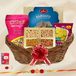 This is a gift of: � Set of 2 Designer Rakhi � 16pcs Ferrero Rocher Chocolate Box � Cadbury Celebration Gift Pack (126g) � Lotte Chocopie � Kaju Katli (250g, Haldiram/Bikano/Bhikaram/Reputed Brand) � Haldiram Bhujiya (200g) � A Basket � Free Roli Tika N Chawal