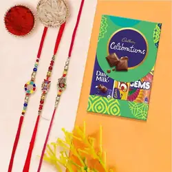 This Rakhi combo comes with: � Family Rakhi Set � Assorted Sweets (500 gms) � Haldiram Bhujiya (200gms) � Cadbury Celebration Gift Box (126g) � Free Rakhi, Roli Tika and Chawal included