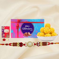 This combo pack has: a) Cadbury Celebration Gift Pack (110g) b) Designer Rakhi Set of 4pcs c) Complimentary Roli Tika N Chawal d) Complimentary Message Card
